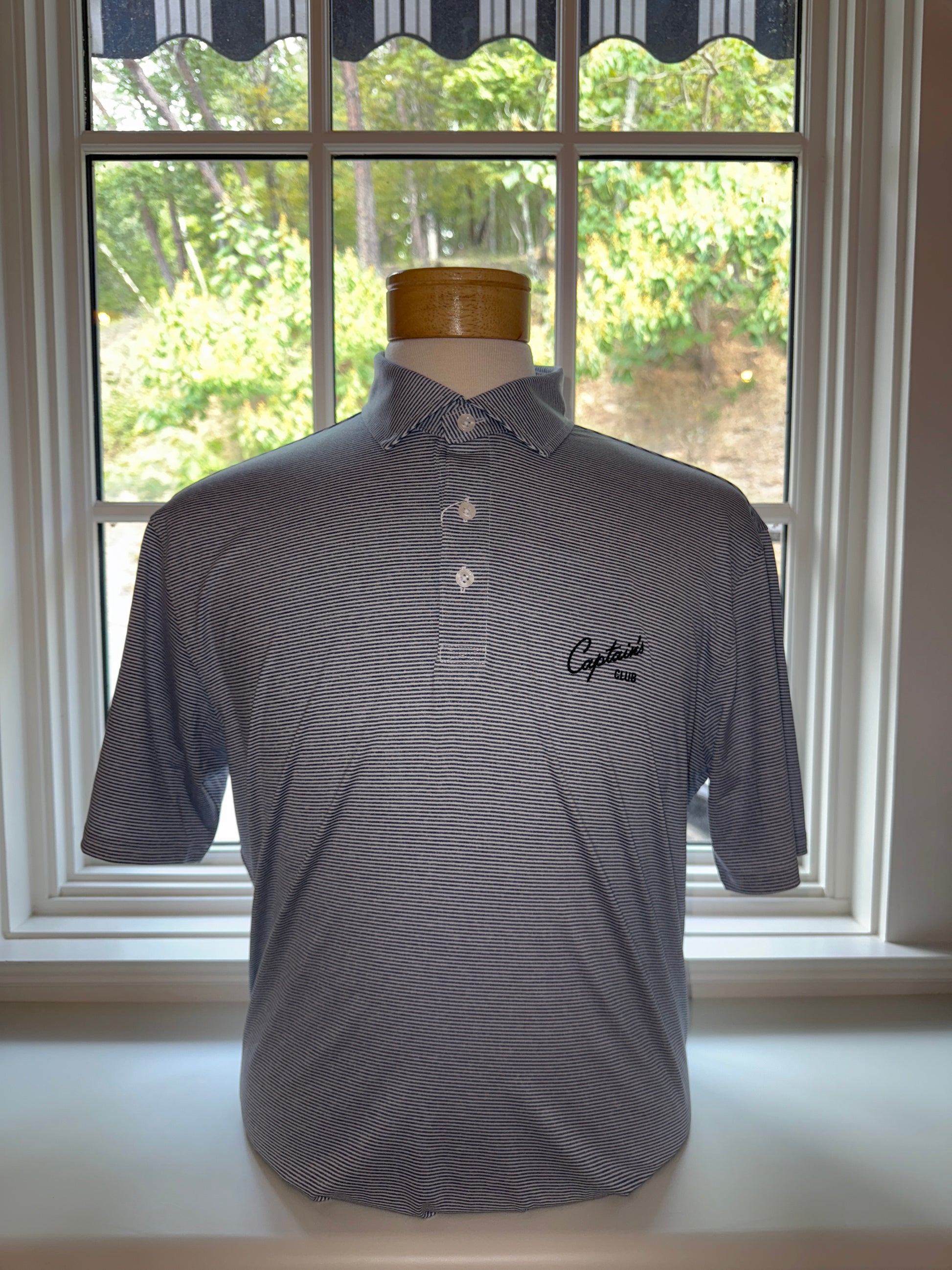 The Holderness & Bourne Perkins polo features a modern two-color feed stripe pattern for a clean, understated look. Made with lightweight yarn-dyed performance fibers, it offers a soft hand feel, moisture-wicking comfort, and breathability for warm-weather wear. Finished with a structured spread collar, the signature H&B tailored fit, and the embroidered Captain’s Club script logo, this style blends classic polish with everyday performance.
